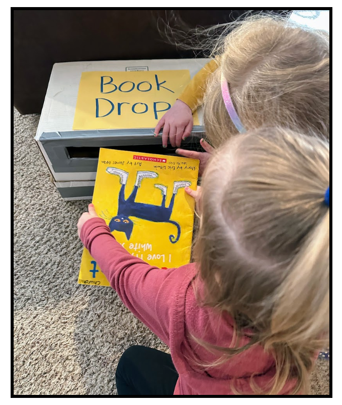 To make our book return, I used a large box that I cut a slit in and then I labeled the top as shown below. My Littles loved returning the books through the slit, taking the top off the box and reshelfing the books over and over again!.