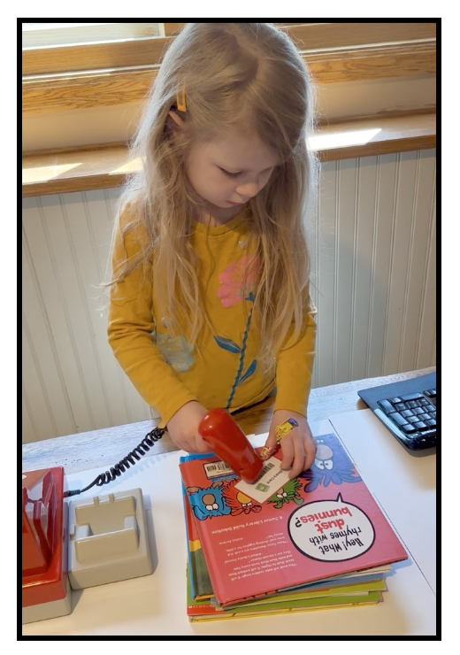 I was lucky to have a cash register from when my own children were little, one that included a scanner. It works perfectly for checking out books.