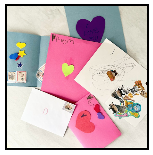 They colored and they wrote messages (there’s nothing like a motivated 4-year-old who’s learned how to write I Love You!). They glued things together and stuffed envelopes. I sat with them and made some of my own cards too. They spent 15-20 minutes here and there, coming back to it multiple times during the day.